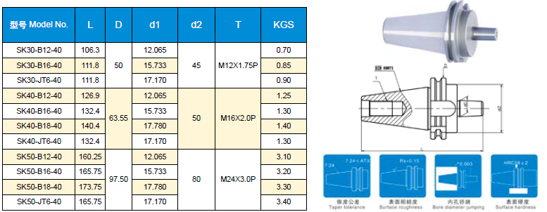 下一篇:SK(DIN69871A)-MTB 斜柄鉆頭套筒 上一篇:SK(DIN69871A) 側固式立銑刀柄